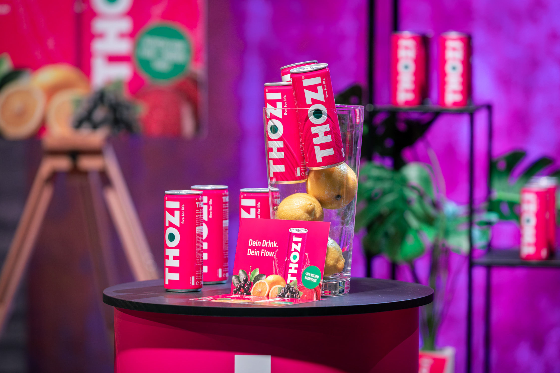 Thozi Getränkedosen mit dem Drink aus Aronia, Johannisbeere und Roter Bete auf dem Präsentationstisch.
